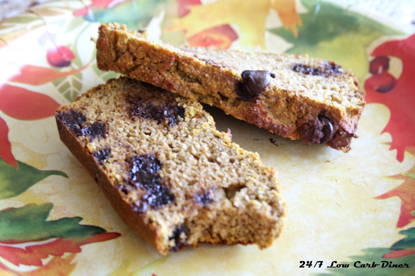 Ready to make this delicious fall treat? Just a couple details. You can use my home made chocolate chips. Recipe here. Or you can use those expensive sugarfree chips. Or you can decide to live with the possible intestinal effects of maltitol in the readily available Hershey's Sugarfree Chocolate Chips. If you tolerate them, these are the cheapest and easiest. You do what is best for you. I left the bag on the counter and my son nibbled them out of the bag all evening. He never reported any tummy issues. But my husband and I have an embarrassing story to tell about the time we ate some sugarfree fudge at a Branson stageshow. Another story I will spare the details on.