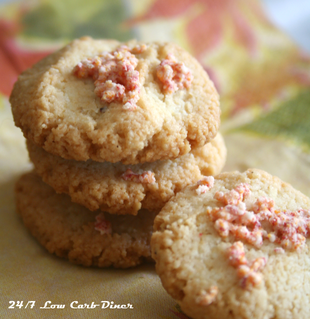 Combine almond flour, sweetener, baking powder and salt together in a large bowl. Stir in egg, butter, vanilla extract , maple flavoring and stevia extract until dough comes together. Use a small cookie scoop to measure out a ball of dough. Roll into a ball. Place on a parchment lined baking sheet and flatten each ball. Bake at 350 degrees for about 12 minutes. Remove to cooling rack. Combine coconut milk powder and powdered sweetener with a drop of yellow and drop or red food coloring. Sprinkle the top of each cookie with the tinted topping.